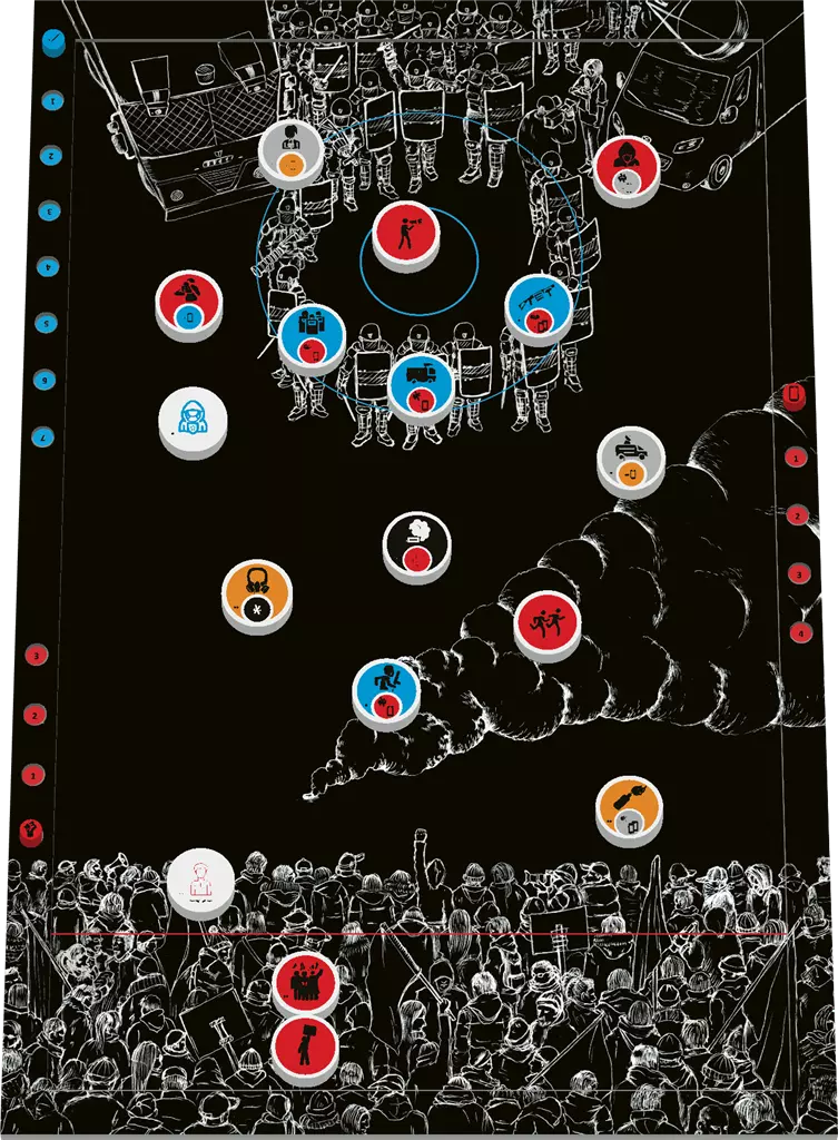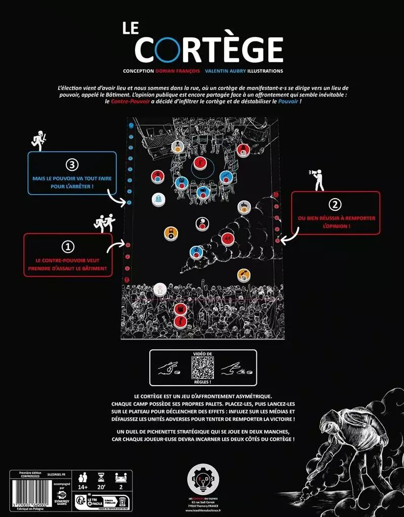 Une personne y incarne le Contre-Pouvoir et l'autre le Pouvoir. Entre stratégie et adresse, déplacez vos unités sur le plateau de jeu pour tenter de remporter la victoire : le Contre-Pouvoir peut gagner en prenant possession du Bâtiment ou bien en remportant l'Opinion, tandis que le Pouvoir gagne en l’arrêtant. Une partie se joue en deux manches, car chaque joueur·euse devra incarner les deux côtés du Cortège !