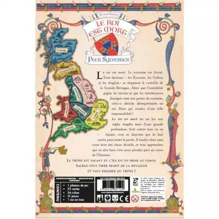 Tout au long de la partie vous n'aurez que 8 cartes pour déplacer les partisans des trois clans sur les territoires disputés, et vous assurer le soutien du clan vainqueur. Si les français profitent de la confusion, c'est celui qui a réunit le plus de partisans de chaque factions qui pourra rétablir l'unité du royaume. Un jeu d'une simplicité unique où chaque décision peut changer le cours de l'histoire.
