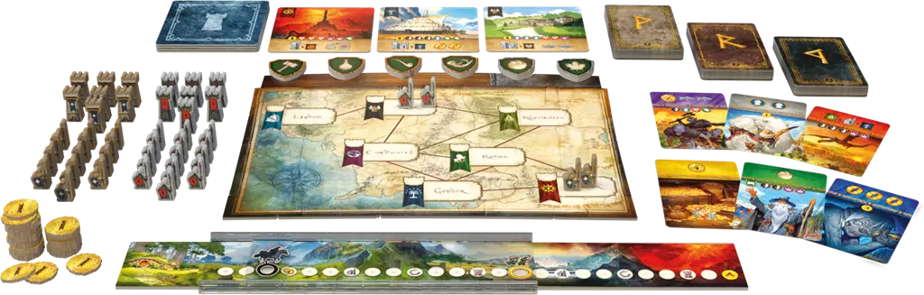 Une partie se joue en 3 chapitres successifs qui se déroulent de façon similaire. Les cartes du chapitre en cours sont mélangées puis placées selon un schéma précis avec certaines cartes visibles, d’autres faces cachées, et des cartes se chevauchant. À votre tour, prenez l’une des cartes accessibles et appliquez son effet : développez vos Compétences, gonflez votre trésor, placez des forteresses sur le plateau central, faites bouger vos troupes, rattrapez Frodon avec votre Nazgul avant qu’il n’atteigne la Montagne du Destin, faites des alliances avec les Peuples Libres, etc.