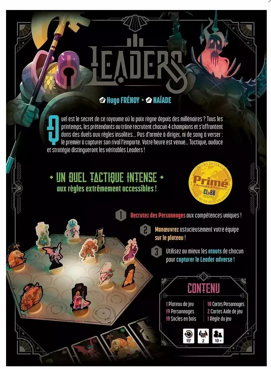 Dans Leaders, chaque joueur incarne un prétendant au trône dans un royaume où la paix règne depuis des millénaires. Le but ? Capturer le Leader adverse en plaçant deux champions à ses côtés ou en l’encerclant complètement. Avec ses mécaniques simples et intuitives, ce jeu offre un défi stratégique intense où chaque décision peut faire basculer la partie.