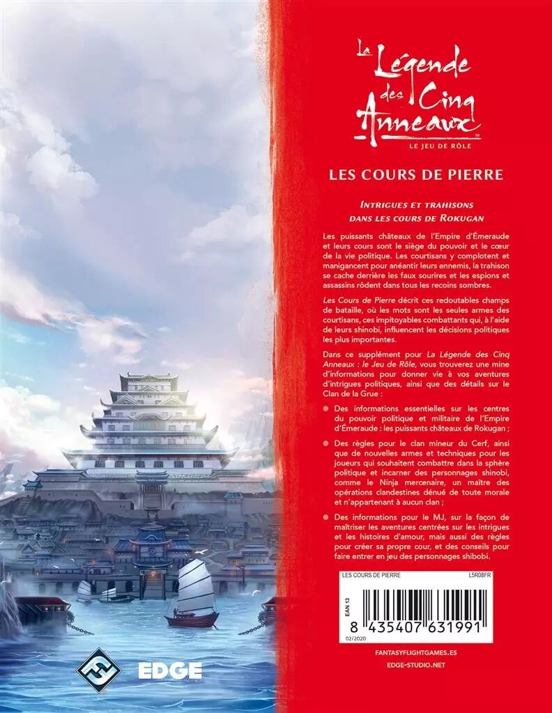 Les Cours de Pierre décrit ces redoutables champs de bataille, où les mots sont les seules armes des courtisans, ces impitoyables combattants qui, à l’aide de leurs shinobi, influencent les décisions politiques les plus importantes. Ce livre vous donne un incroyable accès aux châteaux, donjons et tribunaux de Rokugan, où des batailles de secrets et de mots remplacent le combat. Où une seule erreur peut conduire au déshonneur ou à la mort.