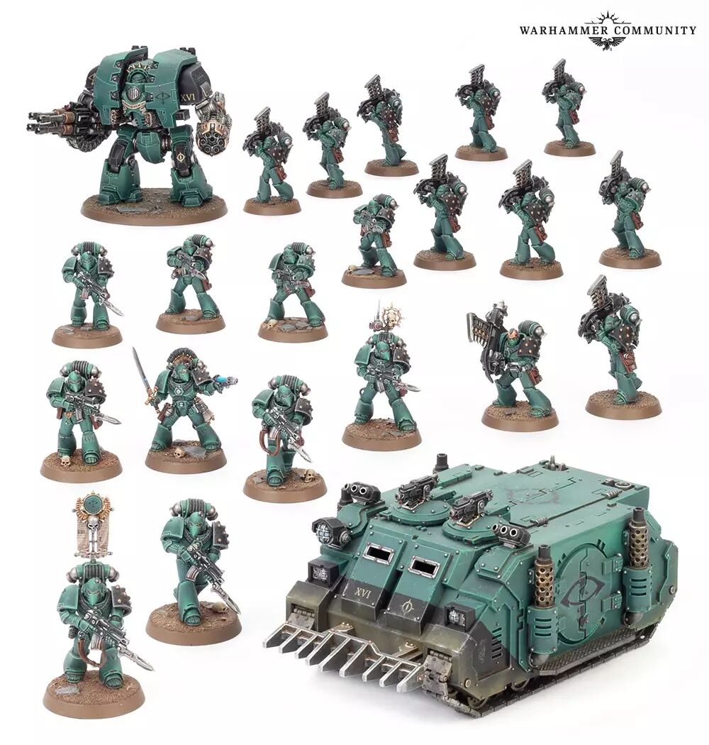 Le set propose également 20 Space Marines en armure énergétique MkVI et un set d’améliorations d’Armes Lourdes contenant 10 lance-missiles et 10 bolters lourds, ce qui vous permet d’assembler chaque groupe de 10 soit comme une Escouade Tactique, soit comme une Escouade de Soutien. La boîte est complétée par une Planche de Décalcos des Legiones Astartes proposant 293 décalcos et deux Planches de Décalcos de Véhicules des Legiones Astartes proposant chacune 44 décalcos.