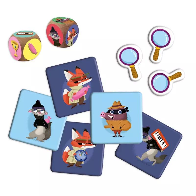 De nombreux objets disparaissent à Hibou city... Retrouve le plus rapidement possible qui les dissimule entre Fred le furet, Robert le sanglier et Max le renard ! Lance le dé Animal et le dé Objet puis retrouve le coupable qui correspond parmi les 18 tuiles Suspect posées face Nuit sur la table ! Une fois le coupable découvert, retourne la tuile face Jour, l'objet qu'il tient entre les mains est beaucoup moins visible, le jeu se complique donc au fur et à mesure de la partie ! Celui qui trouve le bon coupable remporte une loupe, le premier joueur à 8 loupes est élu meilleur détective !