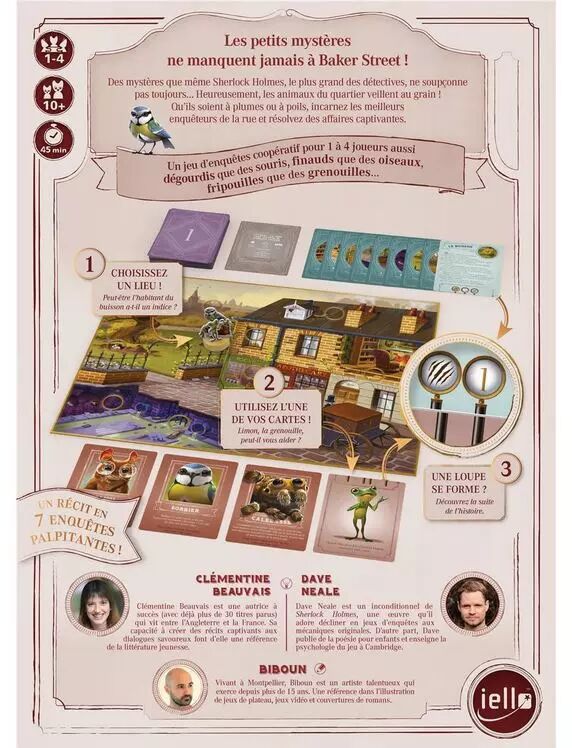 Un incroyable talent d'écriture de Clémentine Beauvais, autrice à succès grâce à sa capacité à créer des récits captivants et de savoureux dialogues, ainsi que Dave Neale un inconditionnel de l'œuvre Sherlock Holmes qu'il adore décliner en jeux d'enquêtes aux mécaniques originales. Sans oublier Biboun un artiste talentueux, référence dans l'illustration des jeux de plateaux, jeux vidéo et couvertures de romans.