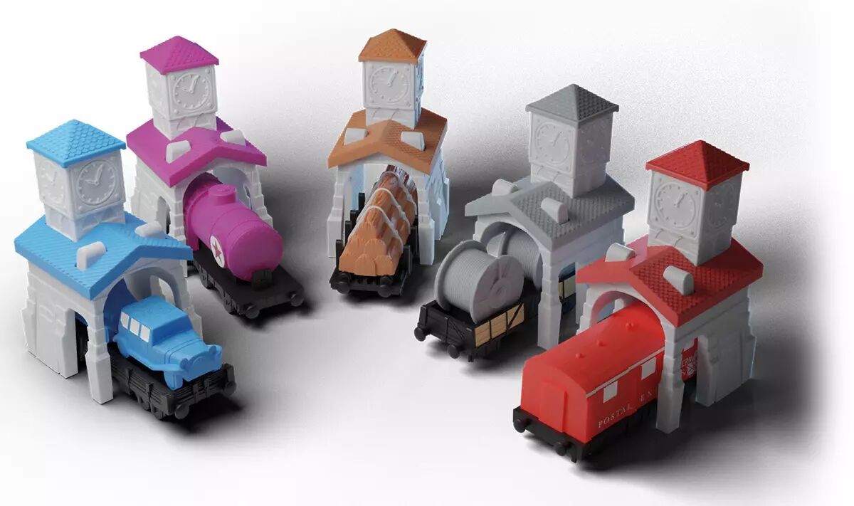 des wagons en 5 couleurs (la boîte contient des Wagons de remplacement. Avant votre première partie, assurez-vous de n'en garder que 45 par couleur pour jouer),