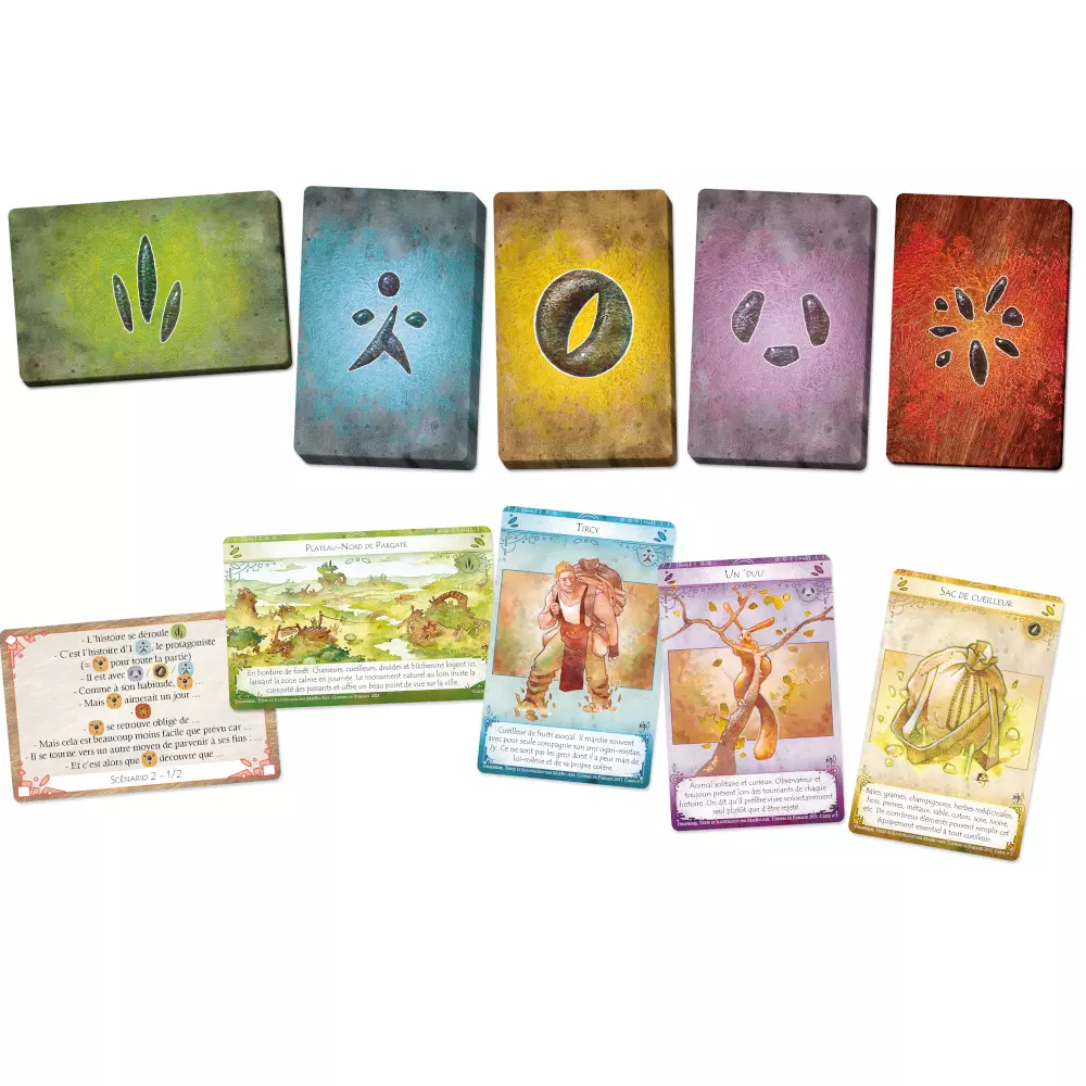 Les cartes scénario présentent l’histoire du début à la fin via un texte à trous que les joueurs complètent à l’oral.