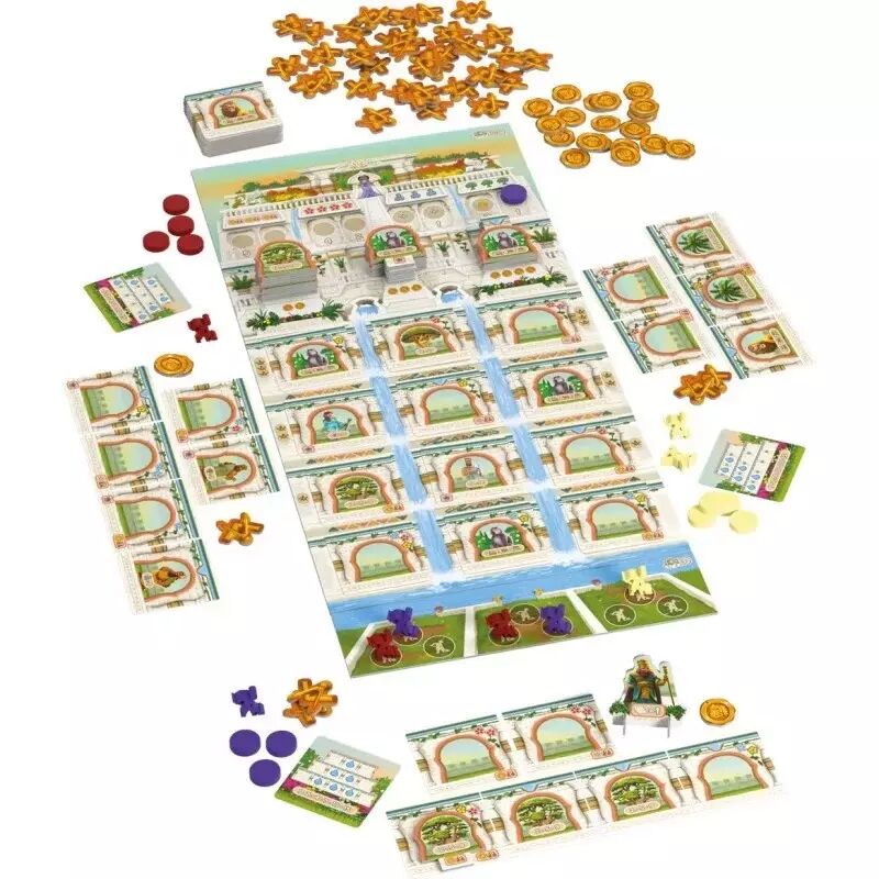 Les Jardins Suspendus séduit d’emblée par son matériel généreux et ses illustrations signées Miguel Coimbra, qui plongent les joueurs dans l’atmosphère majestueuse de Babylone. La boîte contient un grand plateau, deux mini-plateaux, 75 cartes Jardin magnifiquement illustrées, des tuiles Embellissement, des pièces d’or, des outils et même un carnet de score : tout est pensé pour offrir une expérience de jeu fluide et agréable, sans compromis sur la qualité ou la lisibilité du matériel.