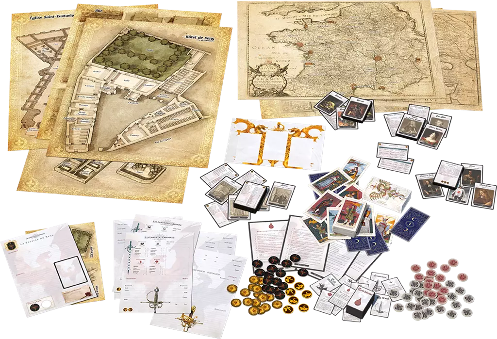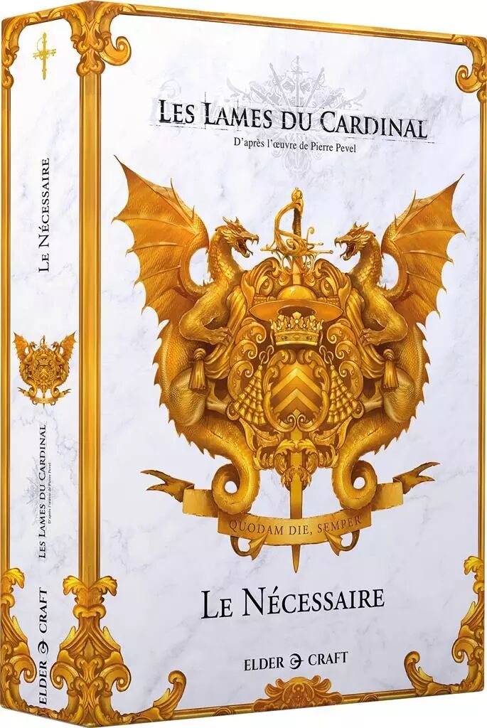 Tarot des Ombres, rivière draconique, cartes de profils, tableau de contacts, deck de combat avec des feintes et des bottes pour donner de la profondeur stratégique à vos affrontements, aides de jeu sur l’escrime, jetons de ressources et fiches de personnages, Le Nécessaire est un coffret qui contient toutes les aides de jeux qui donneront du relief à vos parties.