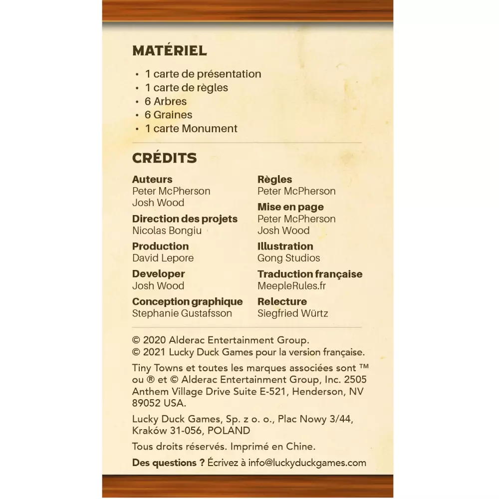 Placez une graine sur une case de votre plateau au début de la partie. À tout moment, si vous construisez sur cet espace, gagnez une ressource gratuite de votre choix. Cependant, si vous terminez le jeu avec seulement la graine restante et aucun autre espace vide, il se transforme en un arbre à 2 points !