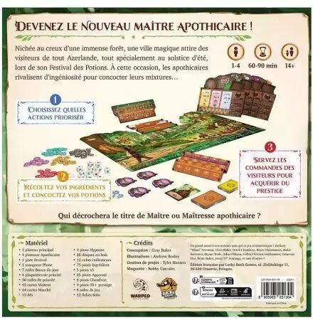 Les Potions d’Azerlande utilise un mécanisme unique de sélection d’actions simultanées où la compréhension des objectifs de vos adversaires à chaque tour vous donnera l’avantage. Décidez de boire vos nouvelles potions pour obtenir des boosts temporaires et des pouvoirs prolongés ou de les donner à un groupe de voyageurs en constante évolution pour obtenir des points et d’autres bonus. Après 6 tours, le joueur qui aura accumulé le plus de prestige sera le vainqueur !