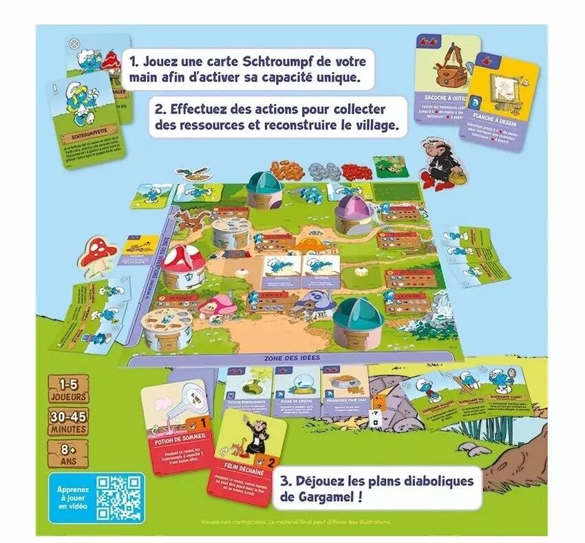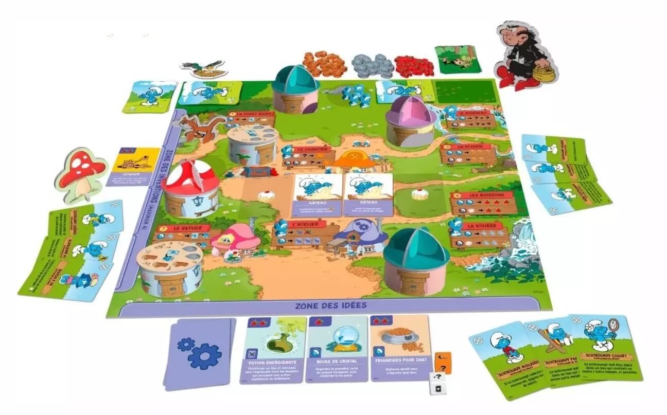 La boîte contient un grand plateau village, 9 meeples Schtroumpfs, standees détaillés de Gargamel et Azraël, plusieurs jetons, cartes, dés et tuiles. L’univers graphique coloré et soigné ravira petits et grands, pour une expérience ludique et conviviale.
