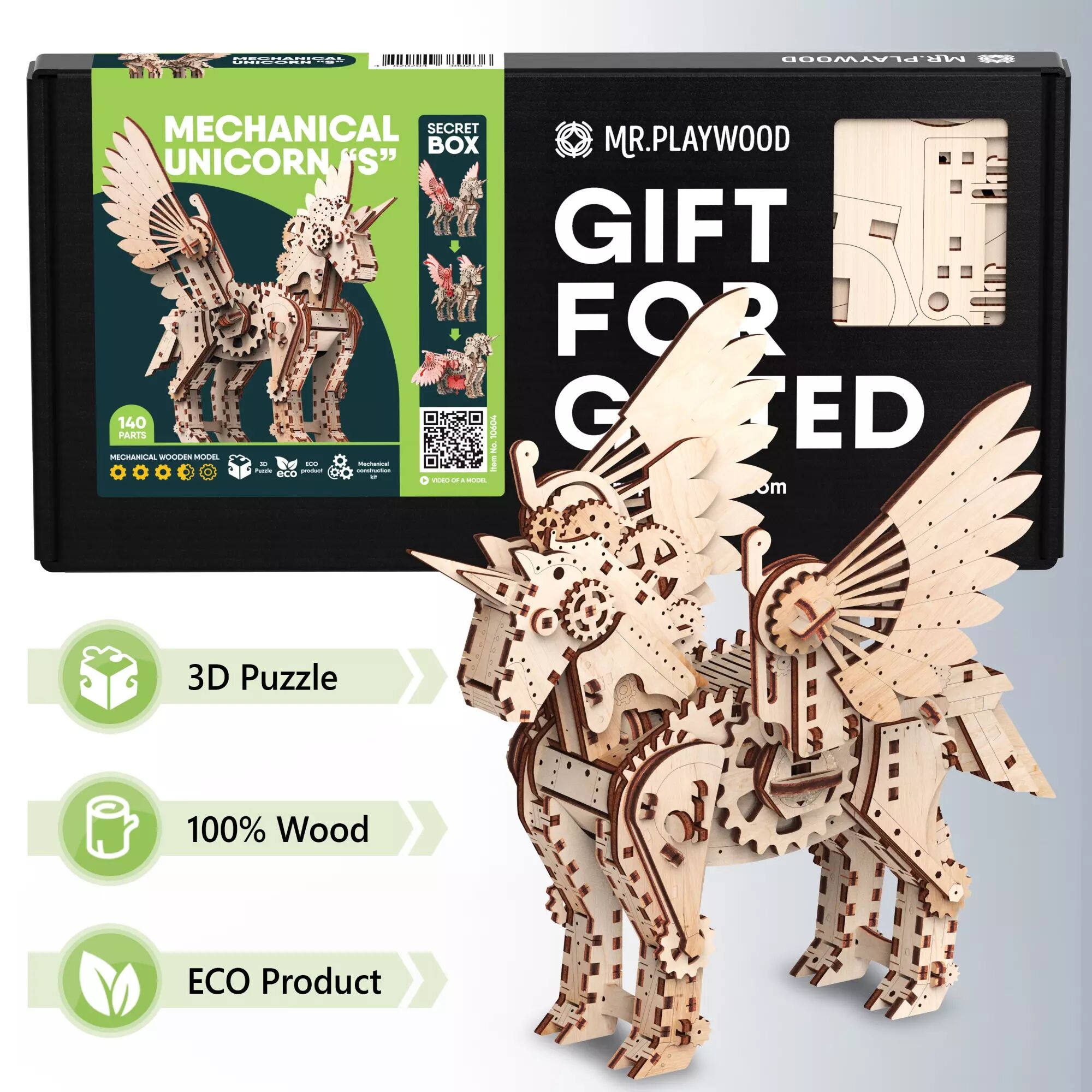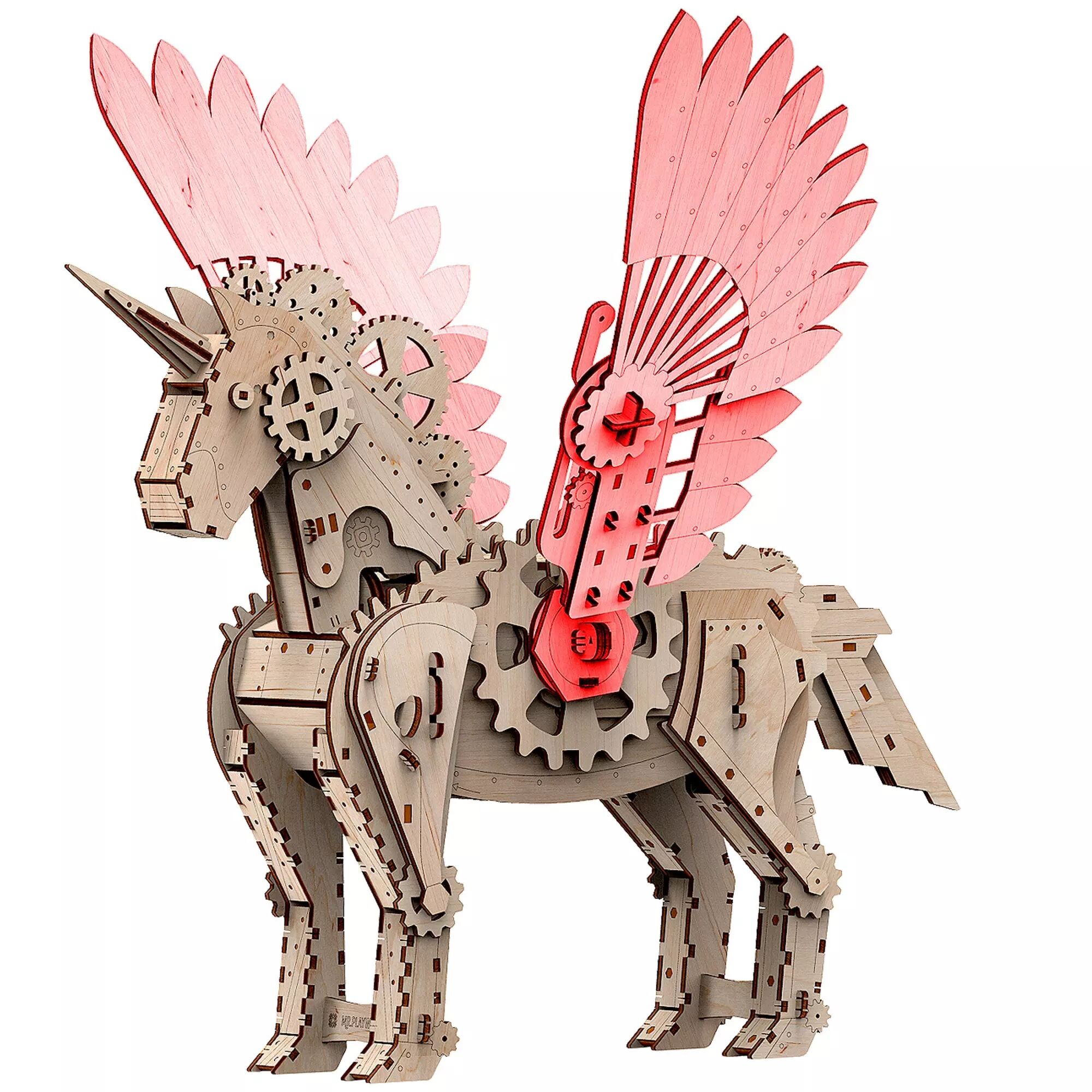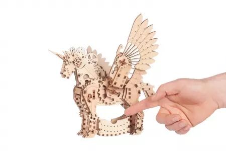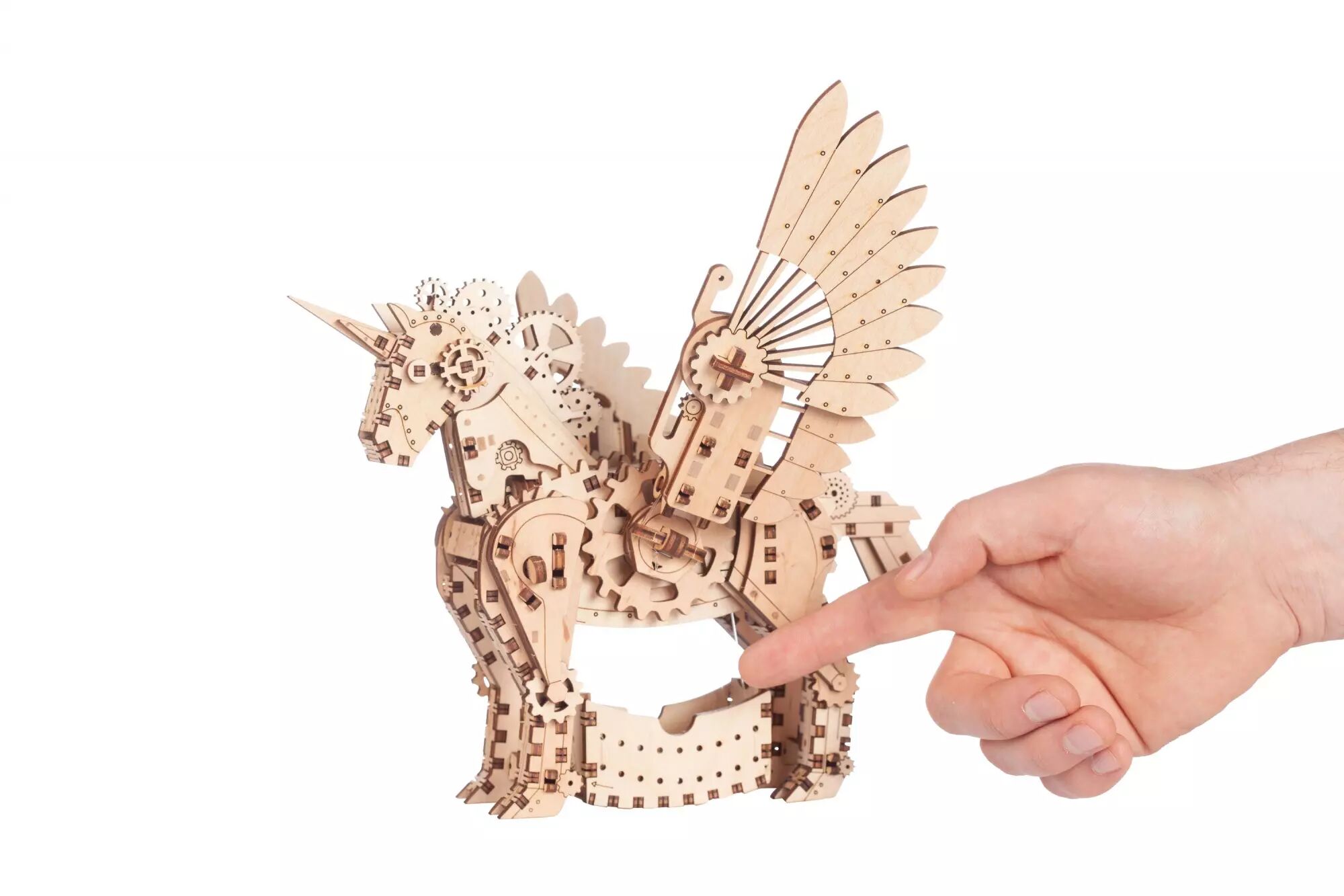 Dans sa petite version, assemblez puis faites déplayer ses ailes à cette magnifique licorne tout en bois grâce à un système d'engrenages ingénieux