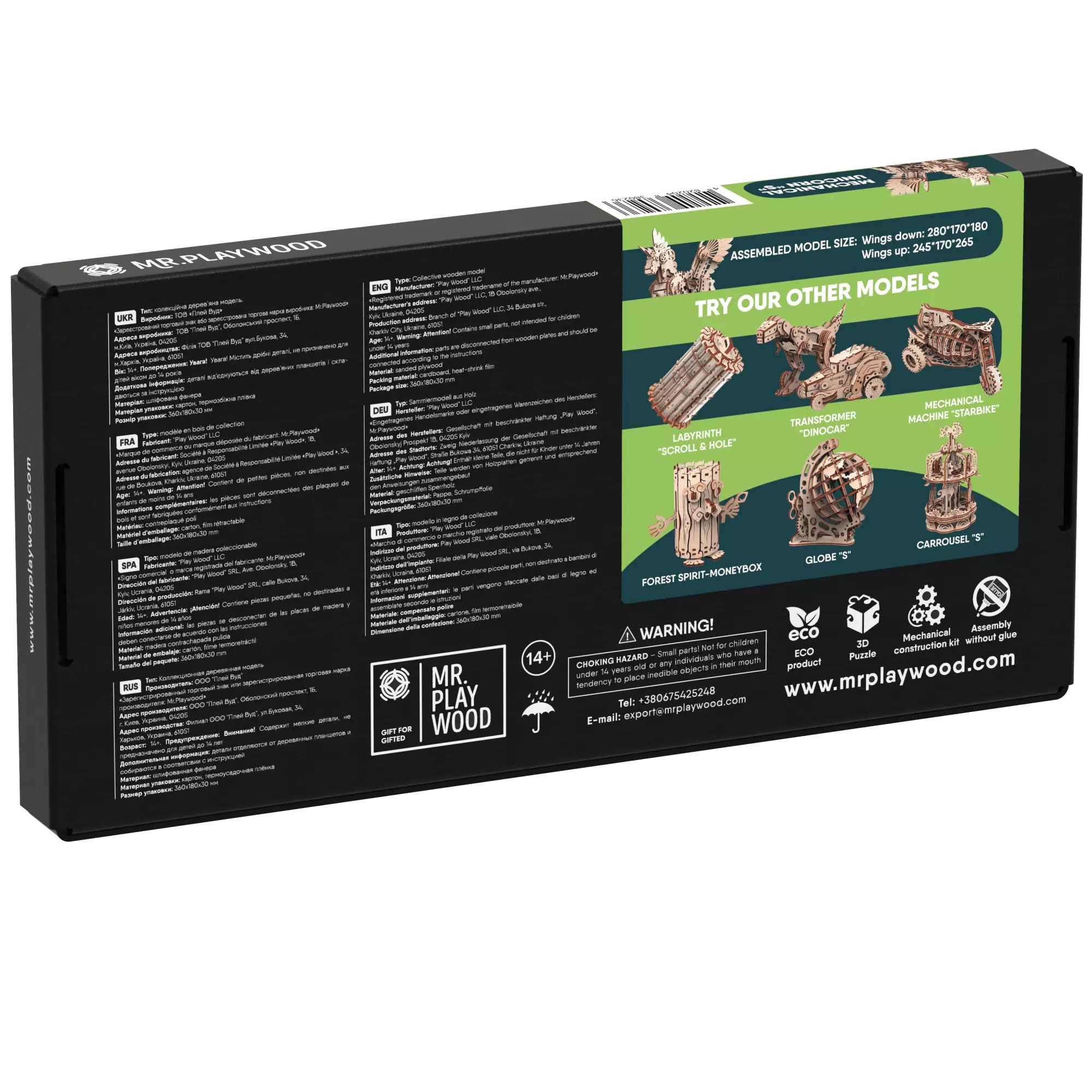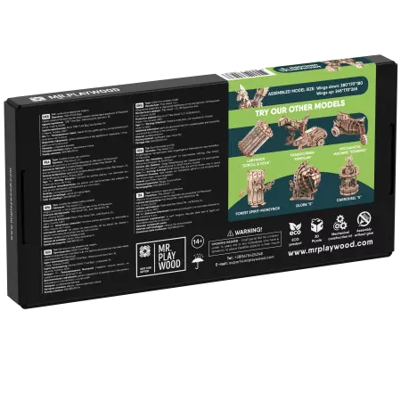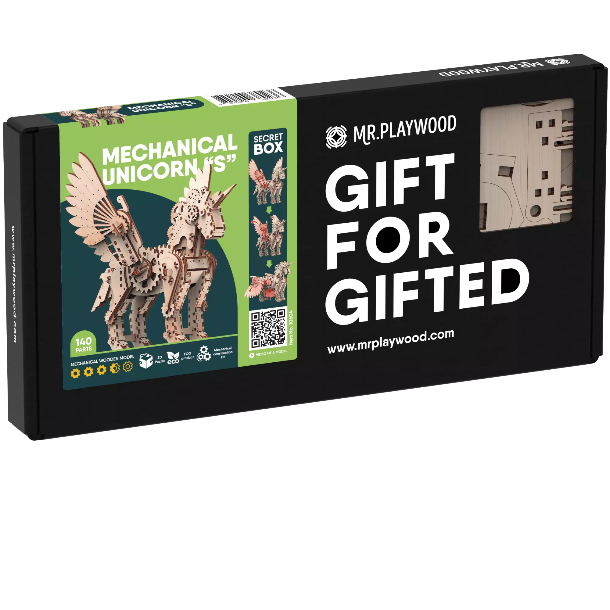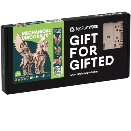 Dans sa petite version, assemblez puis faites déplayer ses ailes à cette magnifique licorne tout en bois grâce à un système d'engrenages ingénieux