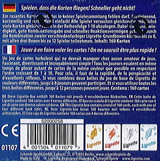 Réf. : PIX236 Ligretto est un jeu de cartes de rapidité dans lequel les joueurs essaient en même temps de placer autant de cartes de la même couleur que possible en respectant l'ordre croissant de 1 à 10.