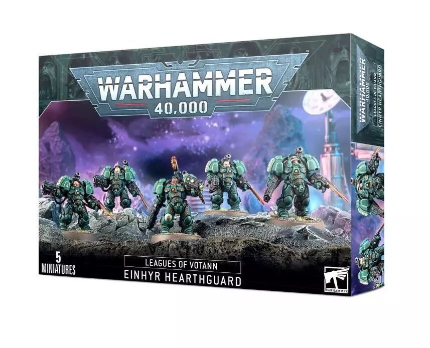 Ce kit plastique permet d'assembler cinq Âtregardes Einhyrs, des Cognats d'élite équipés des meilleures armes et armures à leur disposition. Les exo-scaphandres massifs et couverts de runes leur permettent d'encaisser les tirs concentrés de leurs ennemis, et incorporent un lance-grenade monté sur l'épaule. Chaque figurine peut être équipée de diverses armes de tir et de mêlée : un fusil à plasma EtaCarn ou un désintégrateur volkanite pour répandre la destruction à distance, et un gantelet à percussion ou un gantelet-lame à plasma pour les combats au corps à corps. Ce kit contient 19 têtes interchangeables : 12 têtes nues uniques, cinq casques et deux heaumes avec visière ouverte. Une figurine peut être assemblée comme chef Hesyr équipé d'un marteau à percussion et d'un cimier au choix parmi deux.