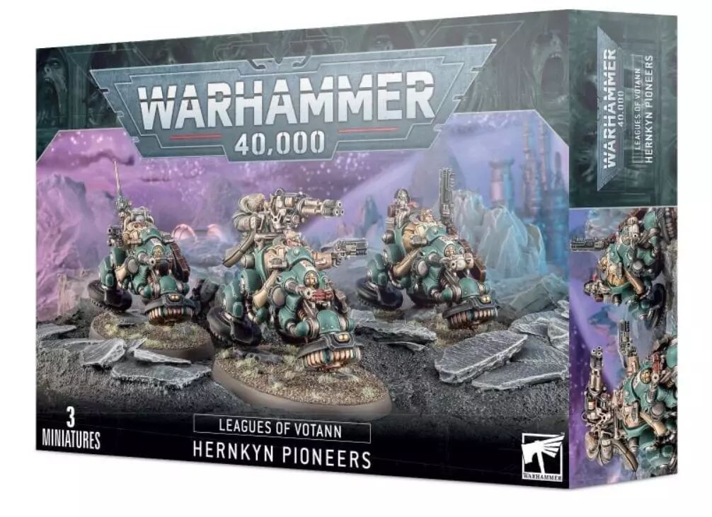 Ce kit palstique permet d'assembler trois Pionniers Hernkogs, des Cognats conduisant des motos antigrav manœuvrables. Chaque véhicule comprend un autocanon à magna-rail monté sur la coque, tandis que les pilotes sont armés de revolvers bolters et de fusils à pompe bolters, soit tenus en main soit accrochés à la moto, ainsi que de grenades à percussion gravitiques. Le kit contient un large choix d'équipement spécialisé : une moto peut être accompagnée d'un artilleur arrière utilisant soit un canon rotatif HYLaser soit un faisceau à ions, tandis que d'autres motos peuvent être équipées d'un Projecteur sur rail, d'une panoplie de transmission multibande ou d'un scanner panspectral. Vous trouverez également un large choix d'arimages et d'éléments esthétiques pour personnaliser chacune de vos motos, ainsi que 10 têtes différentes portant des lunettes, des capuches ou des bonnets de vol, dont une tête de Cognat de Fer.