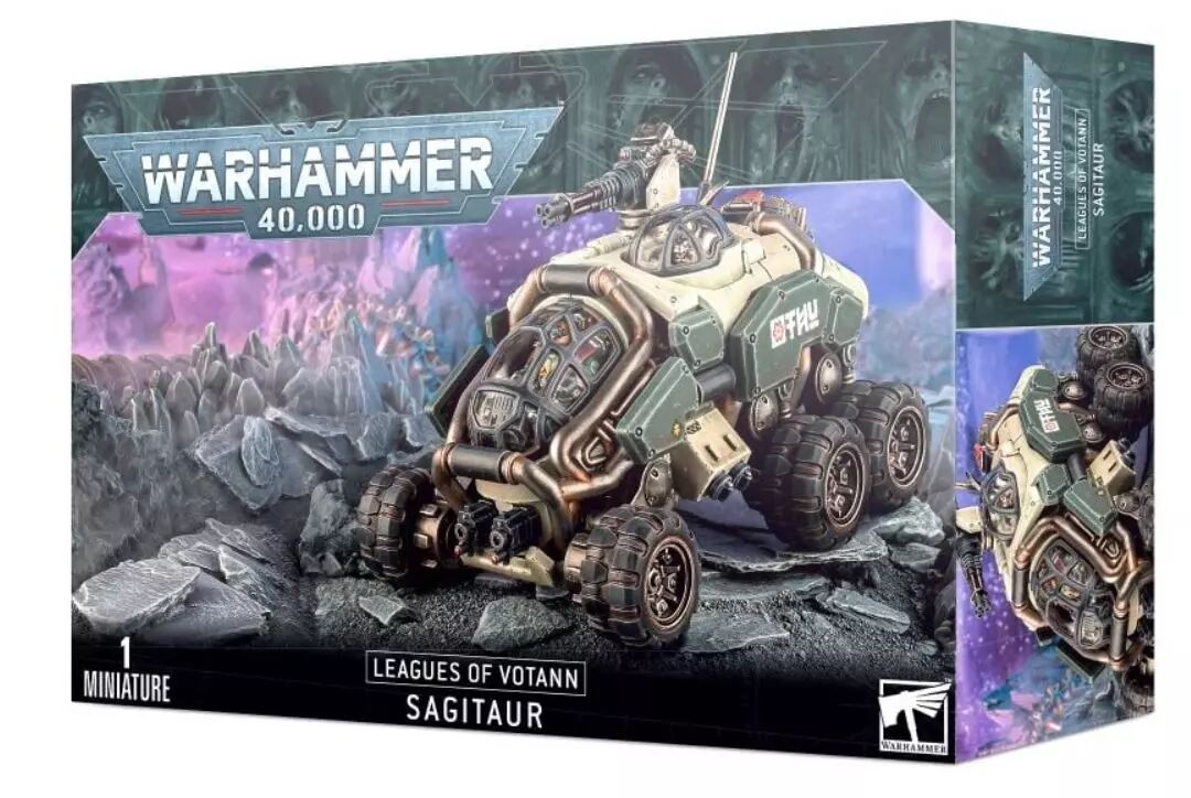 Cette boîte permet d'assembler un Sagitaur, un véhicule rapide combinant une bonne puissance de feu et la capacité de transporter une unité au combat. Ce solide véhicule à six roues dispose d'un canon bolter jumelé monté sur sa coque, d'une trappe de transport arrière et un choix de quatre armes en tourelle maniées par un artilleur robot : un canon à faisceau HYLaser, un lance-missiles L7, un lance-missiles Sagitaur ou un autocanon MATi-R. Ainsi, il peut être adapté à n'importe quelle menace. Le pilote du Sagitaur est visible à travers un écran de plastique transparent et dispose d'un choix de trois têtes pour le personnaliser votre et différencier chacun de vos véhicules.
