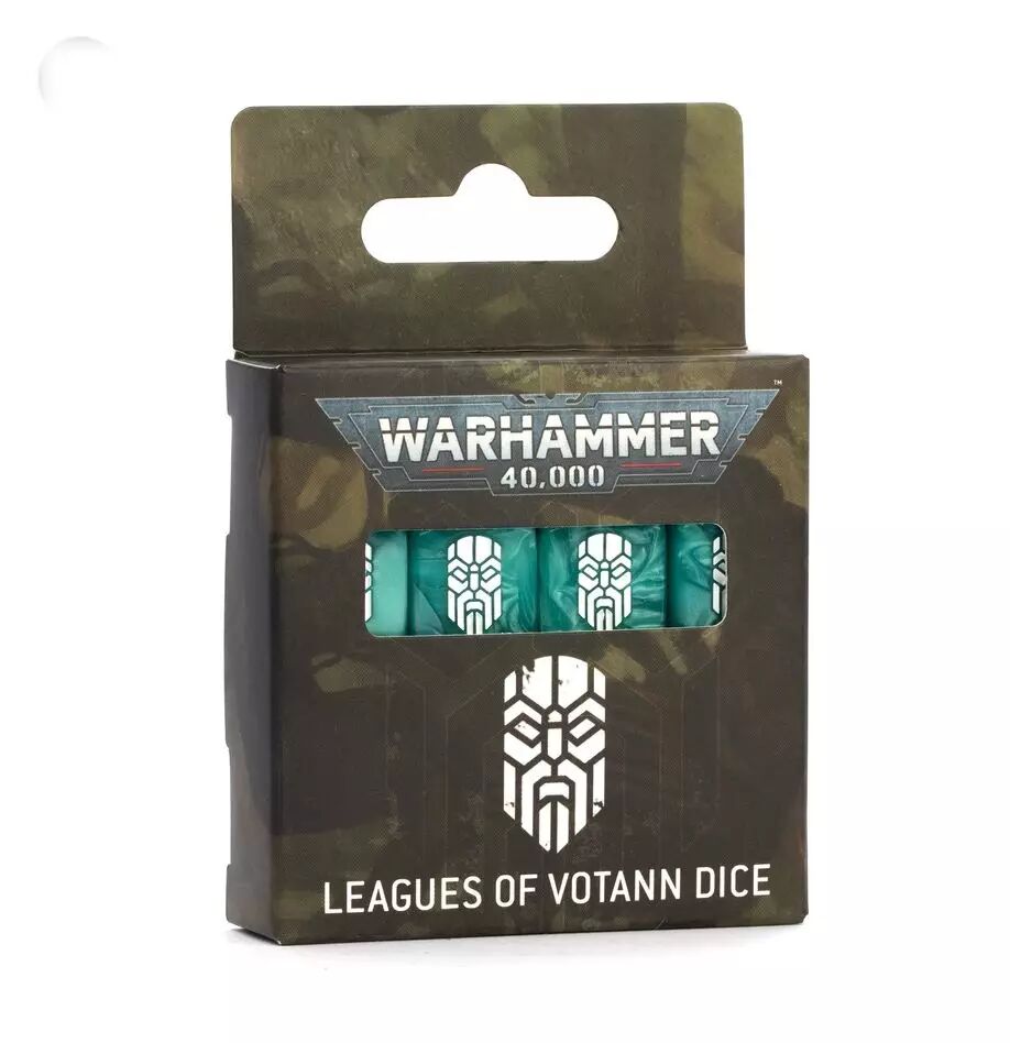Ce set de 16 dés aux arêtes carrées pour les parties de Warhammer 40,000 est sur le thème des Ligues de Votann. Ils sont moulés en plastique acrylique vert marin nacré avec des marquages blancs et ils mesurent 16mm de côté. Les faces 1 à 5 sont numérotées de manière traditionnelle et chaque face du 6 est ornée de l'icône intransigeante des Ligues de Votann.
