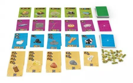 Produire, c'est utiliser une ressource afin d'en obtenir une nouvelle, plus intéressante. Cette bobine de fil vous serait bien utile ? Alors il vous faudra vous défausser d'une carte coton ou bien montrer que vous êtes en possession d'un mouton. Et votre vache ? Allez-vous la défausser pour sa viande ou la conserver pour son lait ?
