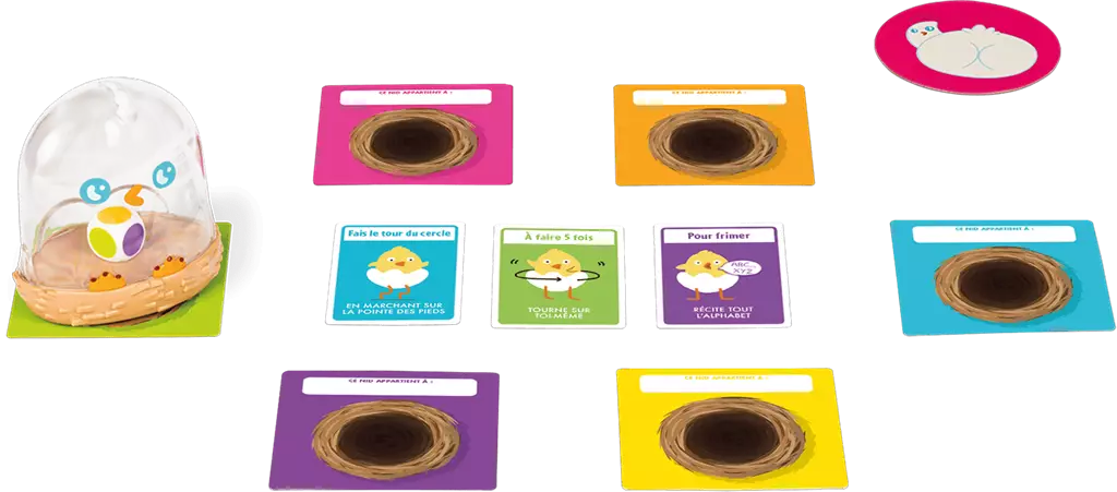 On démarre le minuteur de la cocotte et elle commence à tourner entre les joueurs. Celui qui l’a devant lui la secoue et doit faire l’activité indiquée sur la carte de la couleur obtenue. Si c’est la face rose, il doit quitter la table, aller toucher le popotin et revenir au plus vite pour transmettre la cocotte au nid de son voisin.