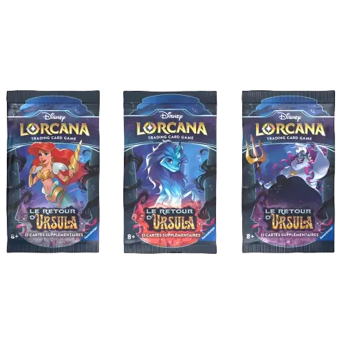 Contrairement aux decks de démarrage, les boosters contiennent 12 cartes aléatoires du set Disney Lorcana TCG Le Retour d’Ursula. Les boosters vous permettent de construire et personnaliser votre deck avec des capacités et des personnages en plus par rapport à ceux trouvés dans les decks de démarrage.