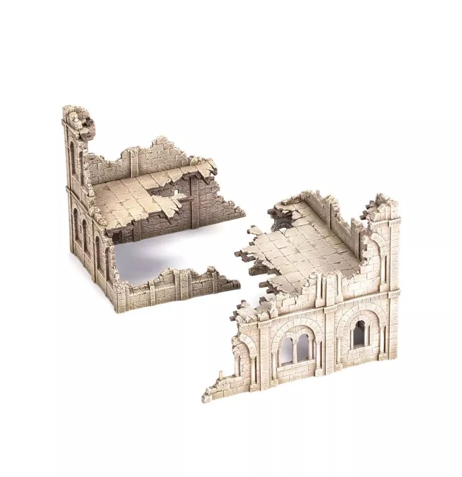 Ce kit plastique permet d'assembler des Gondor Ruins, des bâtiments en pierre détruits par le temps ou la guerre, présentant l'élégante maçonnerie du Gondor avec des motifs en entrelacs, des fenêtres voûtées et des portes en bois renforcées de fer. Le kit permet de créer deux bâtiments distincts, chacun pouvant être assemblé comme des ruines d'un seul étage. Il est également possible d'assembler un bâtiment à deux étages sur lesquels vos guerriers pourront combattre et vos archers se placer pour jouir d'une position avantageuse. De quoi ajouter de la profondeur et de la hauteur à votre champ de bataille.