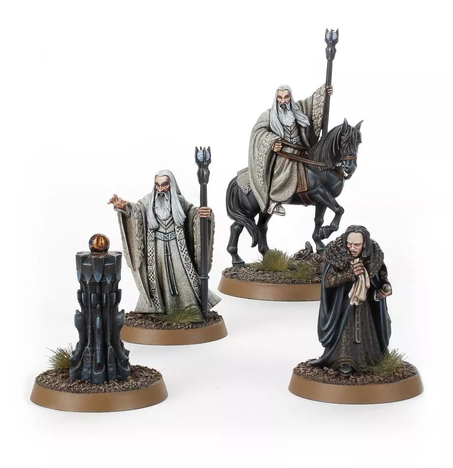 Le set contient 4 figurines plastique - Saruman à pied et monté, Gríma Wormtongue et un Palantír sur un socle. Figurines fournies avec un socle rond Citadel de 40mm et trois socles ronds Citadel de 25mm.
