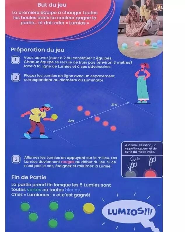 Lumios réinvente le jeu de quilles traditionnel en y ajoutant une dimension technologique et visuelle. Le but du jeu est limpide : être la première équipe à transformer les 5 lumies posées au sol à la couleur de son camp (Vert ou Bleu). Les joueurs se placent face à face, séparés par la ligne de boules, et doivent faire preuve de dextérité pour atteindre leurs objectifs.