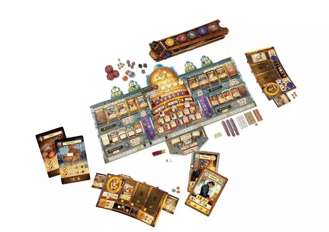 La boîte propose 210 pions et disques en bois, 87 cartes, 133 mini cartes, 65 pièces, 9 aides de jeu, plateaux personnels et principaux, dés en bois, un livret de règles détaillé… Le style artistique élégant de Vincent Dutrait apporte une grande immersion visuelle.