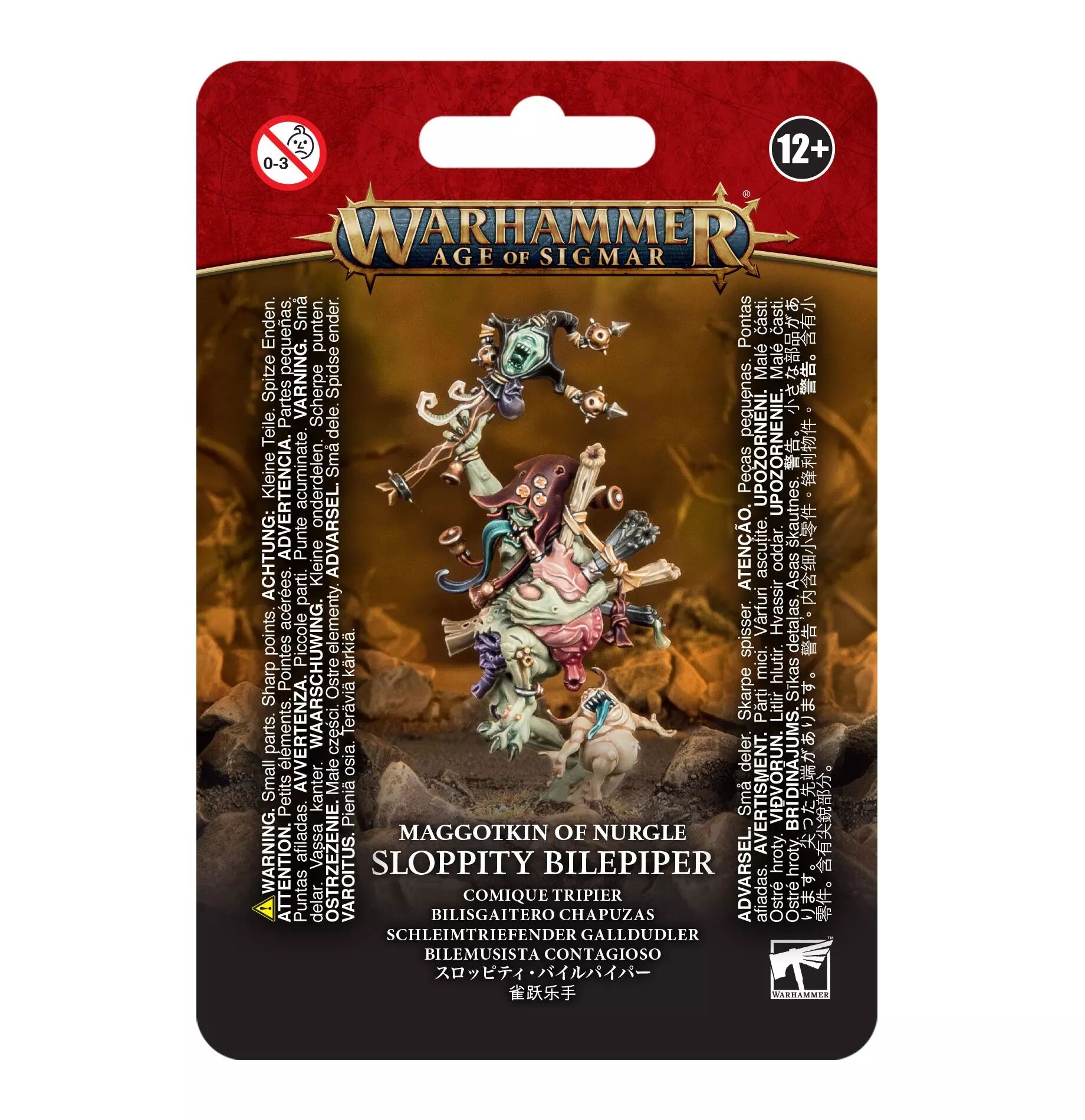 Ce kit plastique contient les composants nécessaires pour assembler un Sloppity Bilepiper. Étonnamment gai et agile, il semble gambader en brandissant sa marotte et en serrant son gésier-biniou sous le bras. La marotte est une arme étrange, une sorte de matraque avec une tête de Plaguebearer portant un chapeau de bouffon orné d'encensoirs cloutés. Le gésier-biniou, ou cornemuse guillerette, est encore autre chose - c'est un organe grossièrement muni de valves et de tuyaux, qui tient ensemble avec des lanières de cuir et de tissu nouées. Le Bilepiper lui-même a des clochettes aux chevilles et aux poignets, une capuche à icônes et une bedaine crevée d'où ses tripes pendent non sans effet comique. Un Nurgling accompagne le Bilepiper, on peut le placer sur son socle où il aura l'air de danser joyeusement au son stertoreux et ronflant des sphincters de l'ignoble biniou.