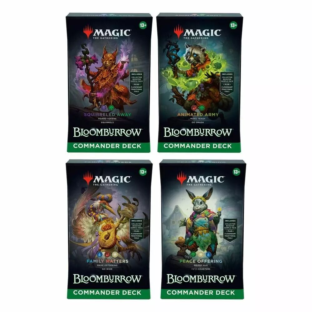 GET ALL 4 BLOOMBURROW COMMANDER DECKS - Make trash and smash with Animated Army, make offspring and go wide with Family Matters, make friends and then end them with Peace Offering, or hoard tokens to defeat your enemies with an army of squirrels with Squirreled Away