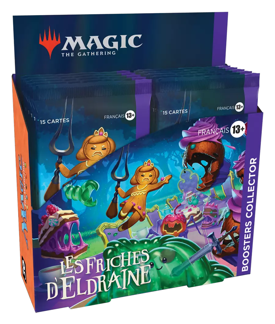 Toute chaude à peine sortie du four, cette fournée de boosters collector est un festin digne d’un monarque ! En plus des rares garanties, des Premium traditionnelles et de la carte à illustration étendue, ces boosters contiennent au moins 3 cartes sans bordure spéciales pour pimenter un peu les choses. Nos compliments au chef ! Votre deck n’aura jamais été aussi beau à table. Cette boîte de boosters collector Les friches d’Eldraine contient 12 boosters collector Les friches d’Eldraine. Chaque booster collector contient 15 cartes Magic: The Gathering et 1 jeton recto-verso Premium traditionnel, avec une combinaison de 5 cartes de rareté rare ou supérieure, 5 cartes inhabituelles, 4 cartes courantes et 1 carte de terrain pleine illustration. Chaque booster contient un total de 10 à 12 cartes Premium traditionnelles.