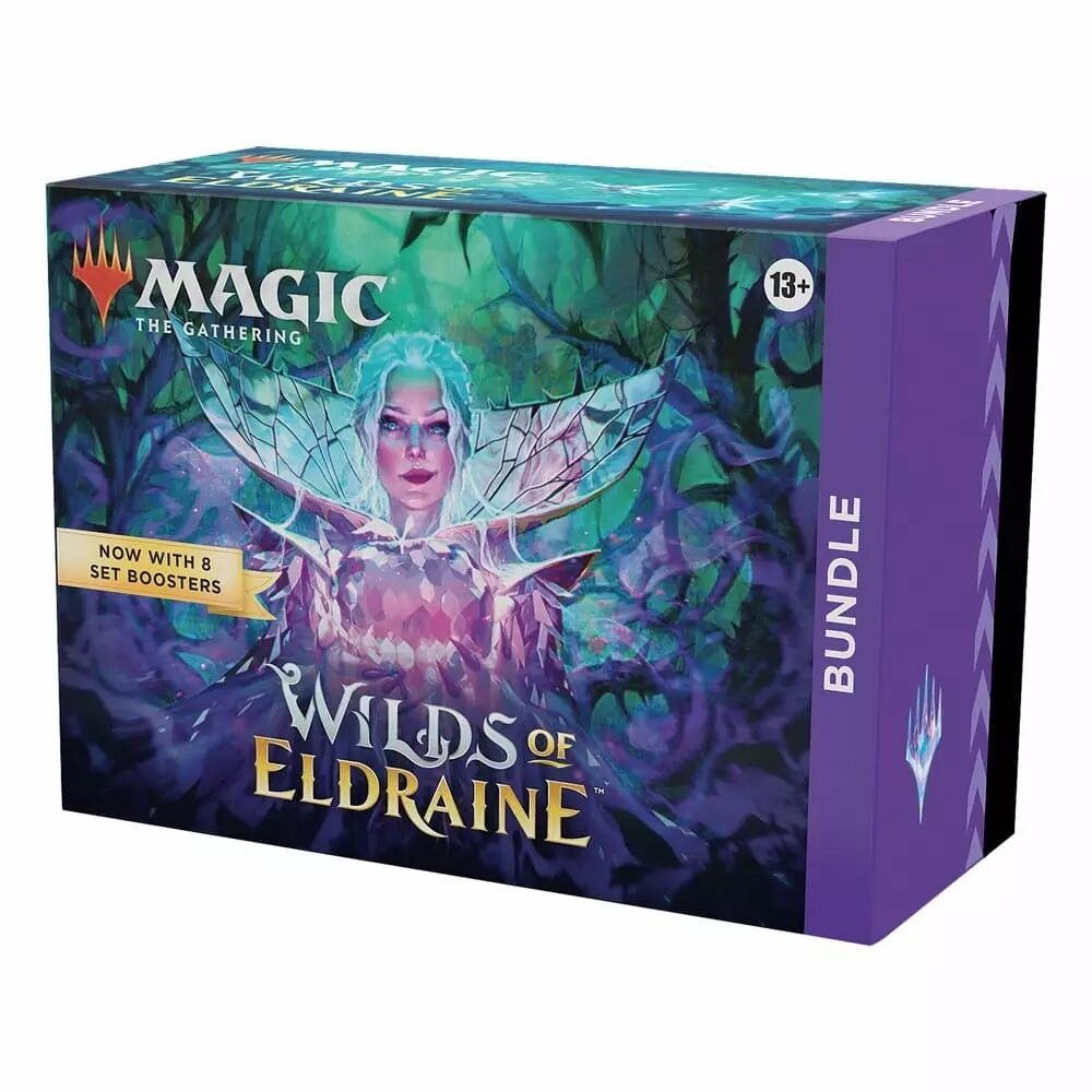 Your next adventure awaits! This Wilds of Eldraine Bundle contains 8 Wilds of Eldraine Set Boosters—the best boosters to open just for fun—plus 1 Traditional Foil card with Bundle-exclusive alternate-art, 40 Basic Land cards (20 Traditional Foils and 20 nonfoils), 1 oversized Spindown life counter, 1 card storage box, and 2 reference cards. Each Set Booster contains 12 Magic cards, 1 Art Card, and 1 token/ad card, or card from “The List” (a special card from Magic's history—found in 25% of packs), with a combination of 1–5 card(s) of rarity Rare or higher and 3–7 Uncommon, 3–6 Common, and 1 Land cards.