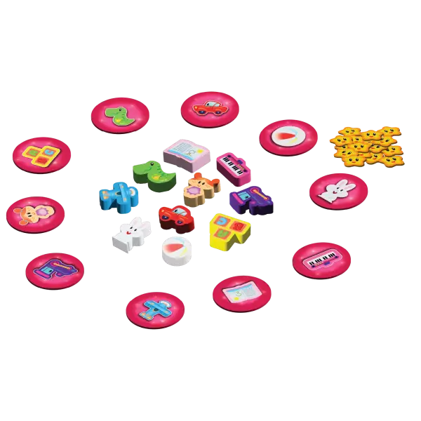 Ce qui séduit d’emblée dans Magicaboo, c’est la qualité et l’originalité de son matériel. La boîte contient 10 objets en bois robustes, 10 tuiles photo joliment illustrées, un foulard magique et 15 jetons Étoile. L’ensemble est conçu pour résister aux manipulations répétées des petites mains, tout en offrant une expérience tactile et visuelle très plaisante. Le foulard ajoute une vraie touche de magie à chaque tour !