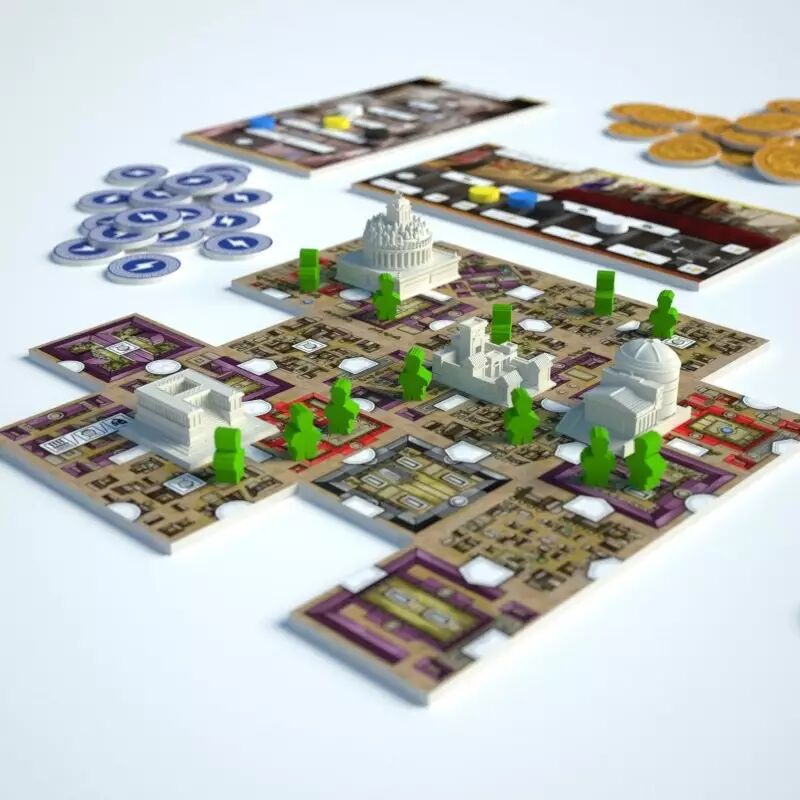 Vous posez stratégiquement vos quartiers sur une grille 5x5, en cherchant à connecter des symboles identiques ou complémentaires pour produire des ressources essentielles comme la population, la foi, l’or, les légions ou les produits de luxe. Ces ressources vous permettront d’acheter des monuments, de bénir vos quartiers et d’étendre votre influence à travers la conquête et la gestion économique.