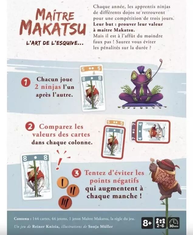Chaque année, les meilleurs dojos présentent leurs apprentis ninjas devant Maître Makatsu. Durant trois manches (représentant trois jours d'épreuves), vous allez devoir poser vos cartes pour tenter de remporter la victoire avec le score de pénalité le plus bas.
