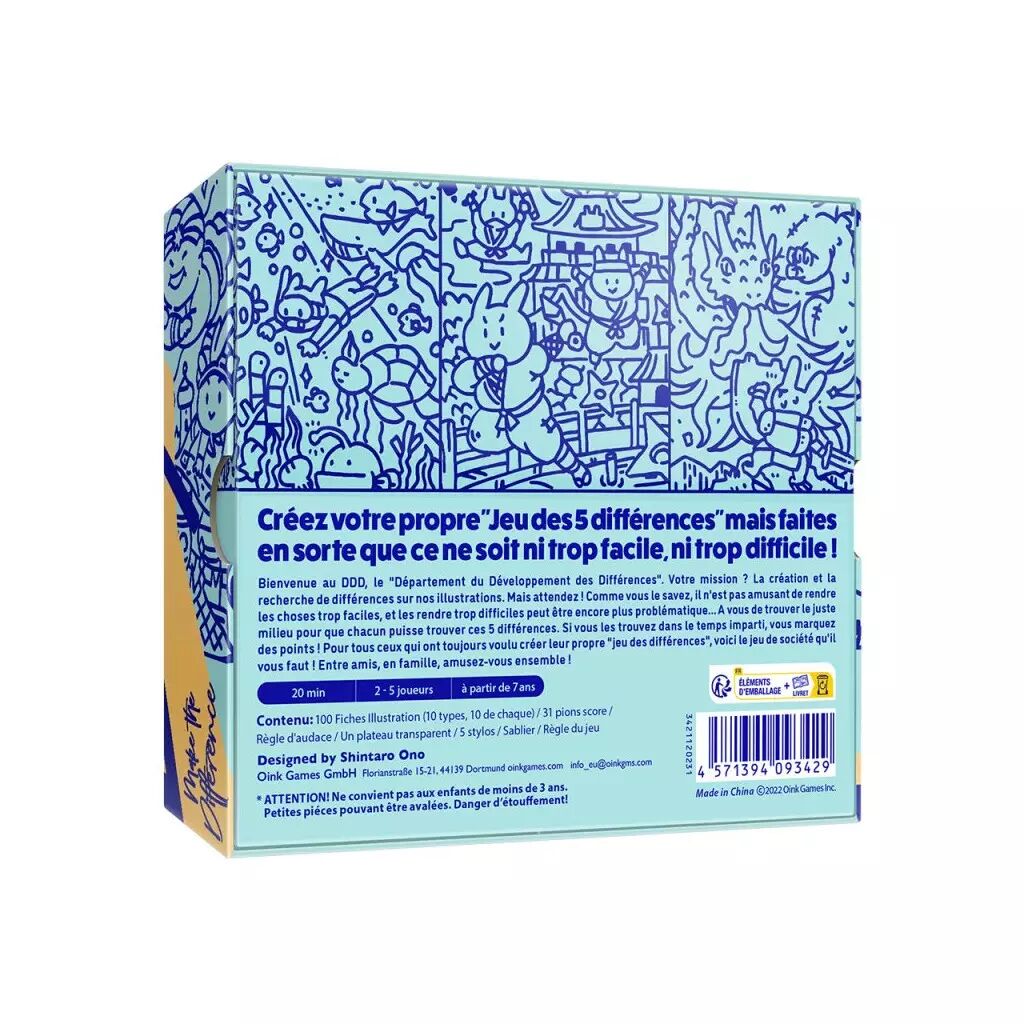 Chaque joueur reçoit une illustration et doit y ajouter cinq différences à l’aide d’un feutre, en respectant quelques règles de base : pas de traits trop épais, une seule ligne par modification. Une fois le temps écoulé, tout le monde part à la chasse aux différences sur les dessins des autres. Les points sont attribués selon la taille et la difficulté à repérer chaque modification, encourageant à la fois le bluff et la prise de risque. Les parties s’enchaînent rapidement et la prise en main est immédiate, même pour les enfants.