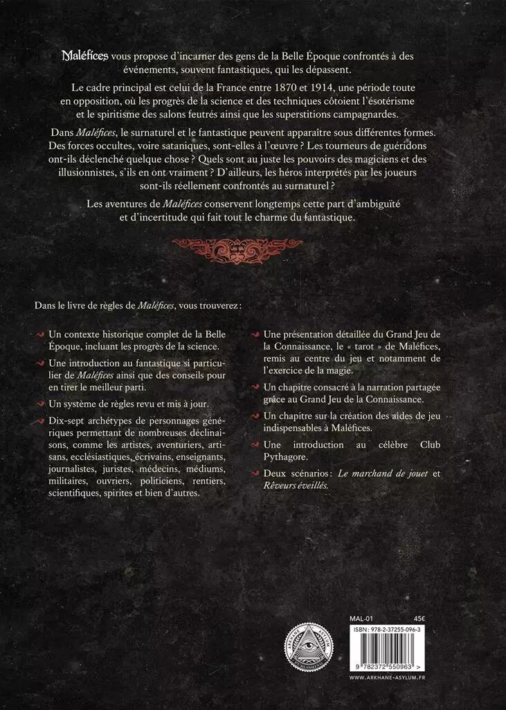 Dans Maléfices les joueurs incarnent des gens de la Belle Époque confrontés à des événements, souvent fantastiques, qui les dépassent. Le cadre principal est celui de la France entre 1870 et 1914, une période toute en oppositions, où les progrès de la science et des techniques côtoient l’ésotérisme et le spiritisme des salons feutrés ainsi que les superstitions campagnardes. Le surnaturel et le fantastique peuvent apparaître sous différentes formes. Des forces occultes, voire sataniques, sont-elles à l’œuvre ? Les tourneurs de guéridons ont-ils déclenché quelque chose ? Quels sont au juste les pouvoirs des magiciens et des illusionnistes, s’ils en ont vraiment ? Les aventures de Maléfices conservent cette part d’ambiguïté et d’incertitude qui fait tout le charme du fantastique.