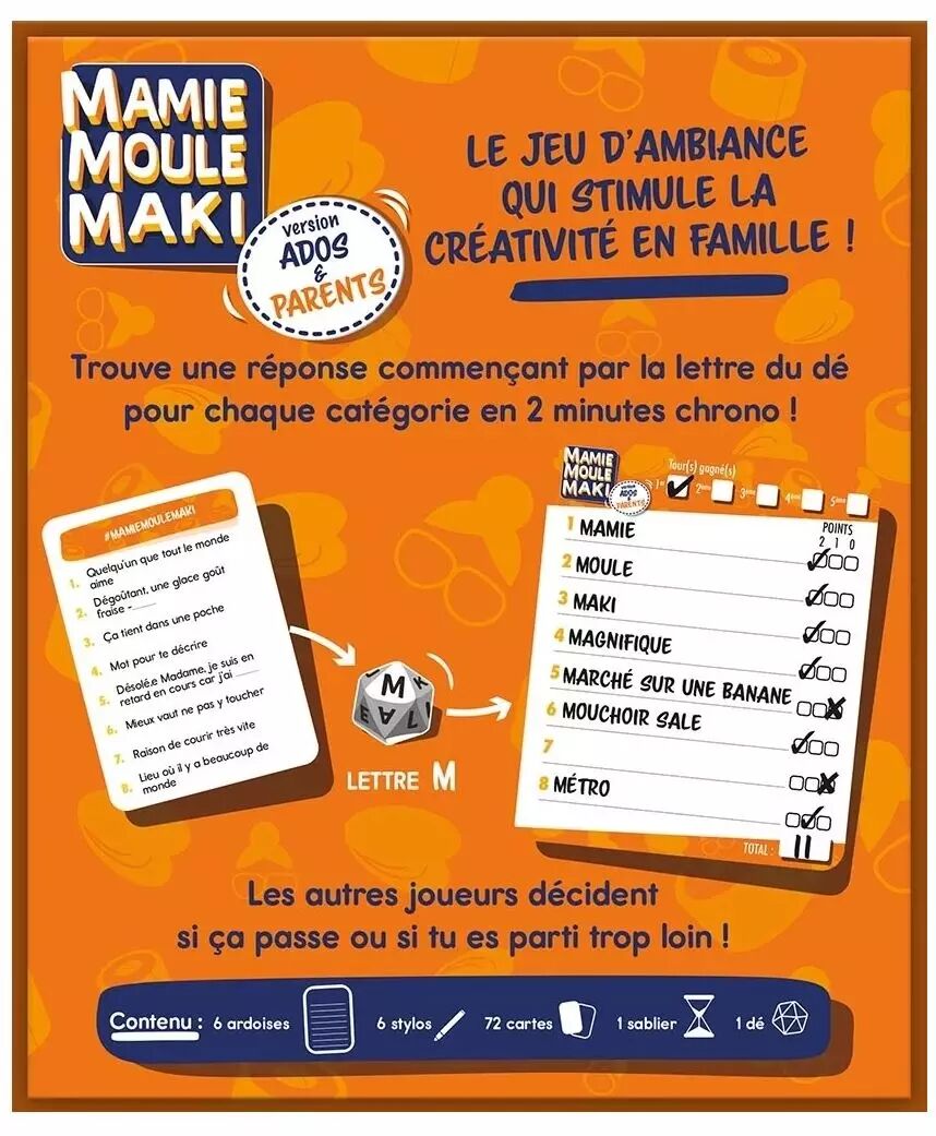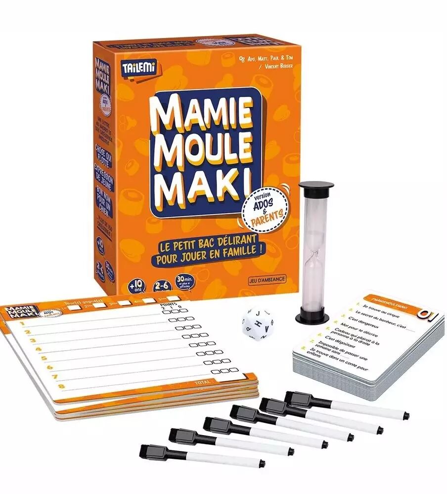 Le matériel soigné et pratique permet de sortir Mamie Moule Maki partout : en vacances, chez les grands-parents ou entre potes. Le format compact et les règles faciles mettent tout le monde dans l’ambiance dès le premier tour.