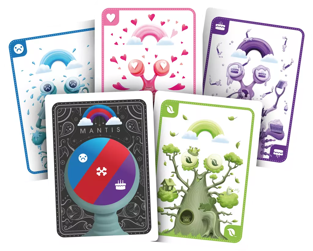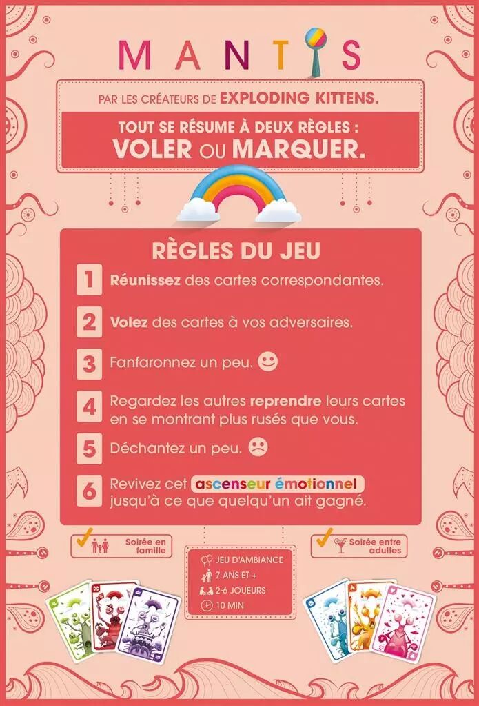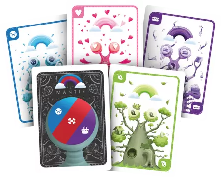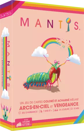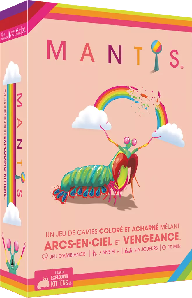 Mantis est un jeu de cartes addictif qui allie habilement hasard, stratégie et psychologie. Plongez-vous dans l'univers coloré de Mantis et enchaînez les parties sans jamais vous lasser. Avec ses illustrations décalées et ses noms de cartes originaux tels que la licorne arc-en-ciel ou le chat ninja, ce jeu apporte une touche d'humour à vos soirées.