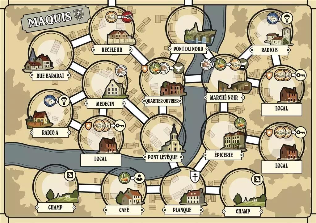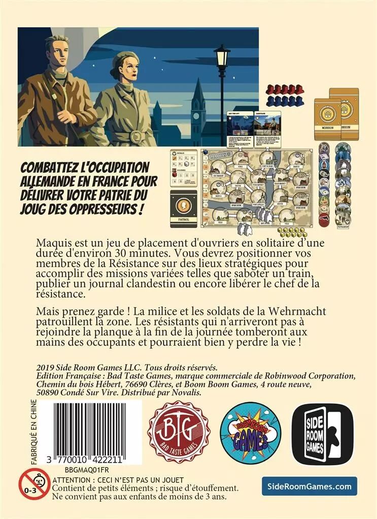 Maquis est un jeu de placement d’ouvriers en solitaire d’une durée d’environ 30 minutes. Vous devrez positionner vos membres de la Résistance sur des lieux stratégiques pour accomplir des missions variées telles que saboter un train, publier un journal clandestin ou encore libérer le chef de la résistance. Les missions sont plus ou moins dures, les dernières extrêmement difficiles à réaliser.