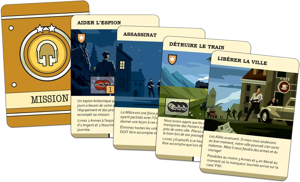 Vous avez 15 Jours pour mener à bien 2 Missions avant que l’Occupant ne vous découvre. Réussissez, et la Résistance aura gagné. Mais si le Moral de la ville atteint zéro, ou si les 15 Jours arrivent à leur terme, l’Occupant réussira à écraser la Résistance. Combattez l’Occupant nazi dans une petite guerre pour délivrer la ville du joug de l’oppression et libérer votre patrie !