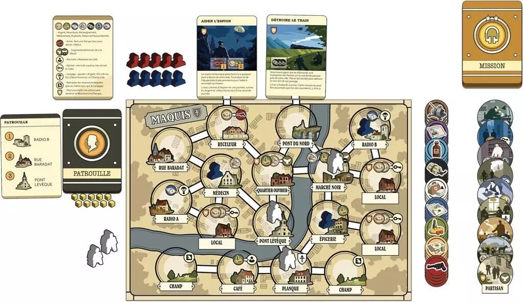 Placez sur la carte, en alternance, vos résistants et les patrouilles. C’est un paquet de cartes qui permet de placer ces dernières, en espérant qu’ils ne viennent pas arrêter l’un de vos pions Résistant ! Ensuite, agissez en activant vos pions (récupérer des ressources qui ont été larguées, demander un largage, ouvrir une planque, tirer sur la milice, accomplir une mission, etc.)