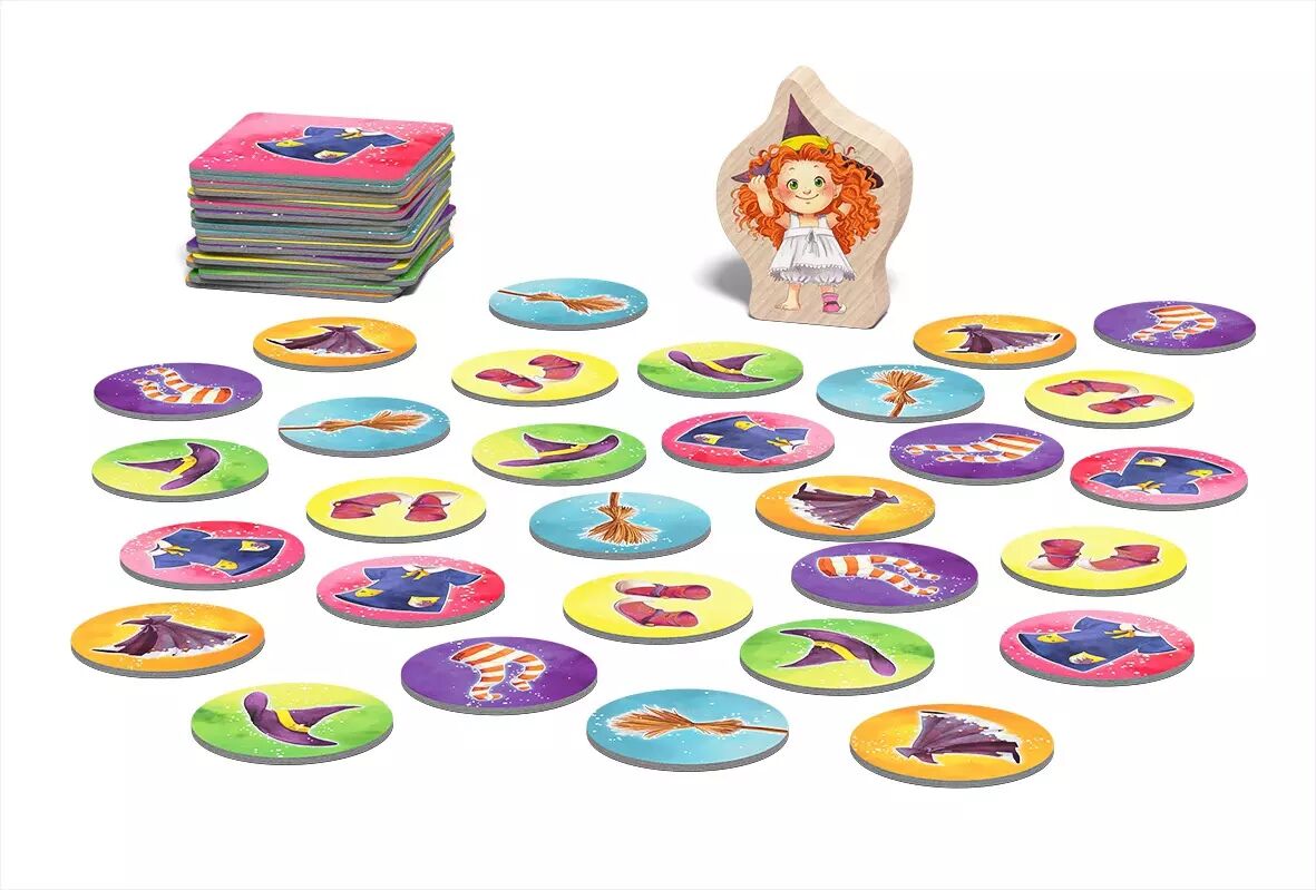 Liste des composants : 1 figurine en bois Marie Magique aimantée, 18 cartes de recherche (chapeau, balai, bottes, cape, robe, collants ; 3 de chaque), 18 tuiles vêtements aimantées (3 de chaque), 12 tuiles vêtements non-aimantées (2 de chaque)