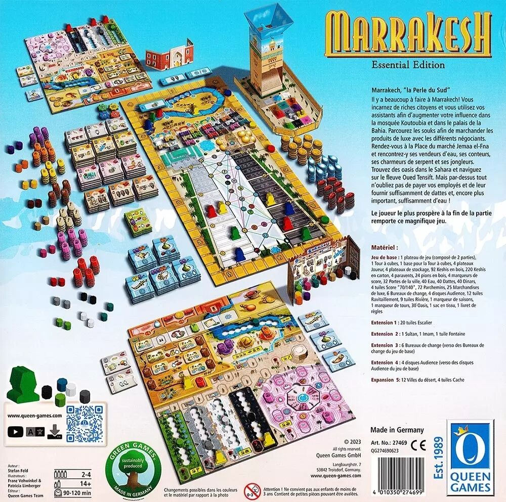 Vous incarnez de riches habitants de la ville. Grâce à votre ingéniosité, vous pouvez gagner de l‘influence à la mosquée et au palais, mener des recherches scientifiques et voyager en caravane à travers le Sahara. Dans le Souk, vous devez marchander afin d‘obtenir les meilleures marchandises. Mais attention, vous devez également penser à récompenser la population et à lui fournir suffisamment d'eau et de dattes. Le joueur qui a le mieux réussi à accomplir ces différentes tâches à la fin de la troisième saison remporte ce jeu passionnant. Utilisez vos assistants pour gagner de l’influence dans la mosquée de la Koutoubia et le palais de la Bahia. Consultez les érudits, visitez le marché de Djemaa el Fna avec ses vendeurs d’eau, ses charmeurs de serpents et ses jongleurs, et découvrez les oasis du Sahara. Vivez des aventures autour du commerce et de l’influence dans la cité royale, mais dans tout cela, n’oubliez pas de récompenser la population et de lui fournir des dattes et de l’eau ! Le joueur le plus prospère à la fin du jeu remporte la partie.
