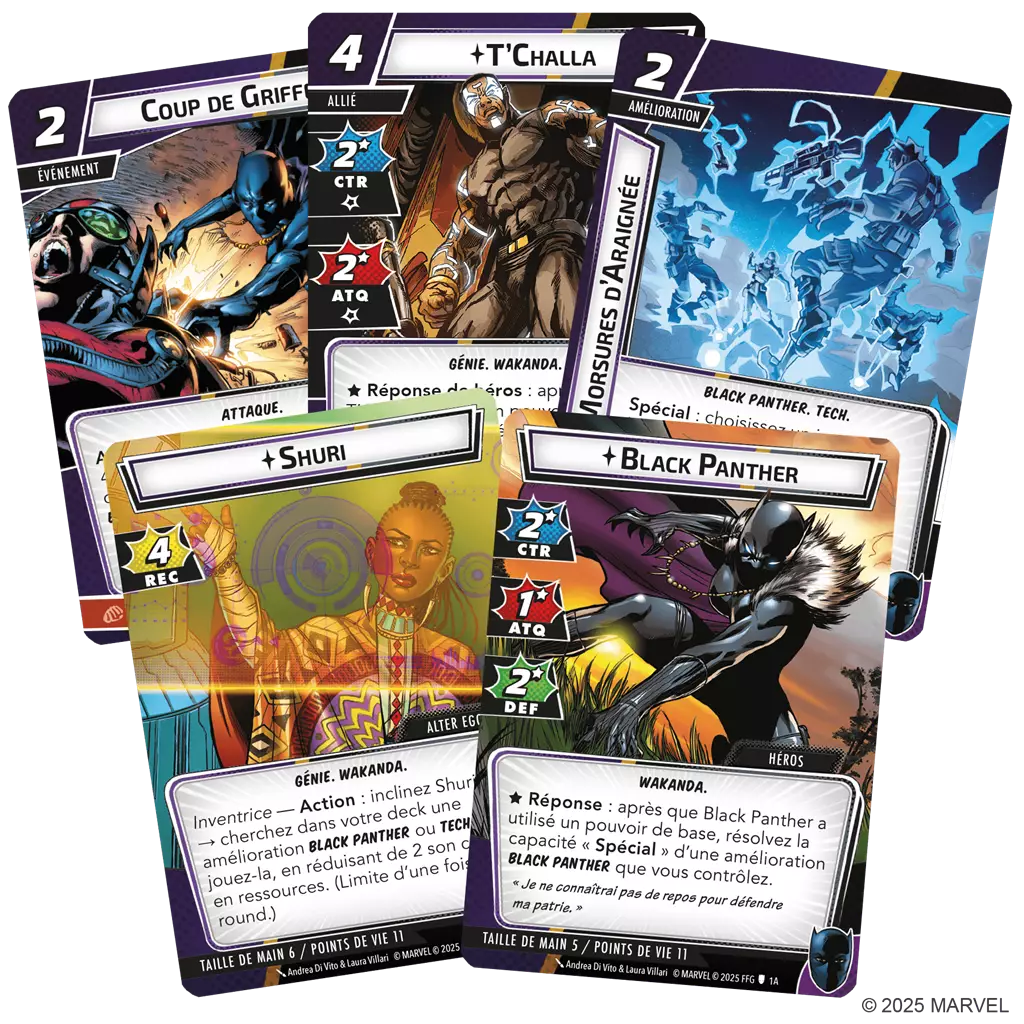 Le style de jeu de Shuri [Justice] est centré sur ses quatre améliorations Black Panther. Utilisez la capacité « Inventrice » de sa forme d’alter ego pour vous assurer d’avoir les améliorations dont vous avez besoin, puis passez sous forme de héros pour déclencher leurs capacités « Spécial », grâce à sa capacité de héros ou en jouant des événements. Chacune de ces améliorations peut être également défaussée pour déclencher de puissants effets. Jouez Aja-Adanna pour les remélanger dans votre deck afin que Shuri puisse les utiliser à nouveau.