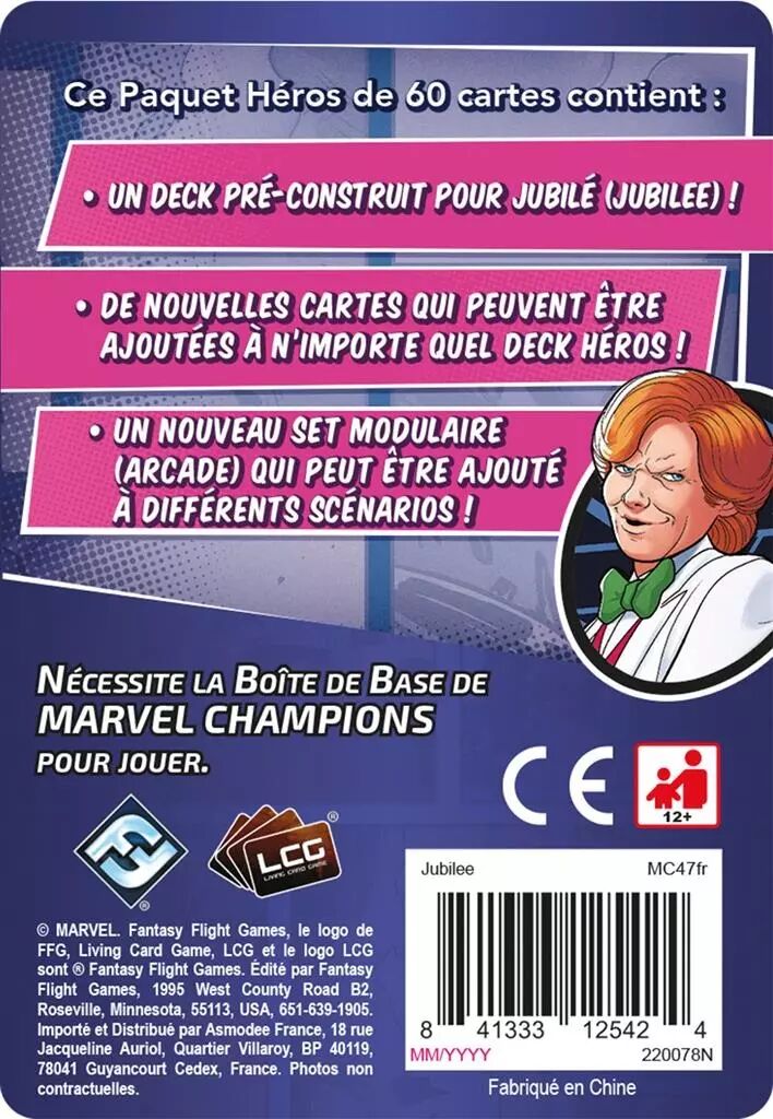 Orpheline à l'adolescence, Jubilation Lee a survécu seule en s'installant dans son centre commercial préféré. Après que son pouvoir mutant de générer de l'énergie explosive se soit manifesté, elle a trouvé une nouvelle maison avec les X-Men. Désormais, elle utilise ses pouvoirs en tant que héros haut en couleur, Jubilee, et elle se fraye un chemin dans vos parties de Marvel Champions : Le Jeu de cartes !