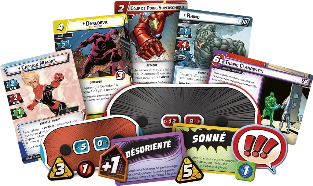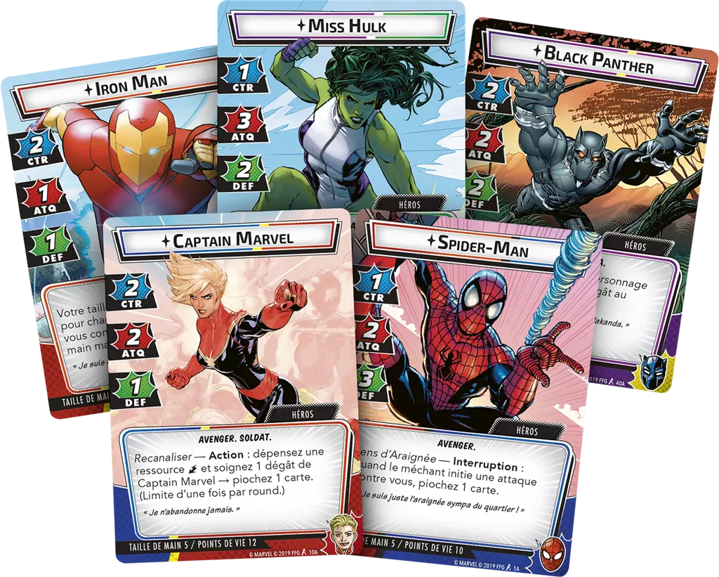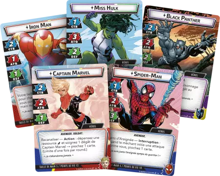 Dans Marvel Champions : le Jeu de Cartes, incarnez des héros emblématiques de l'univers Marvel qui tentent d'empêcher des super-méchants de mener leurs plans à bien. Avec plus de 350 cartes, 100 pions et plein d'autre matériel, la boîte de base de Marvel Champions JCE vous offre tout ce dont vous avez besoin pour entamer votre aventure dans cet univers sous les traits d'Iron Man, Captain Marvel, Spider-Man, Black Panther ou Miss Hulk. Coopérez et combinez vos pouvoirs et ceux des autres héros pour abattre Rhino le dévastateur, Klaw le rusé et Ultron la terreur !
