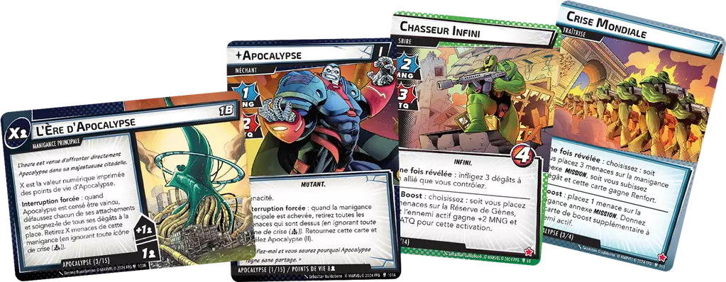 Cette extension de campagne vous propose deux nouveaux héros, Bishop (Commandement) et Magik (Agressivité), chacun avec leur deck préconstruit prêt à jouer. En face, elle vous défie avec cinq nouveaux scénarios qui mettent en scène le règne despotique du mutant immortel Apocalypse et ceux qui luttent pour le renverser.
