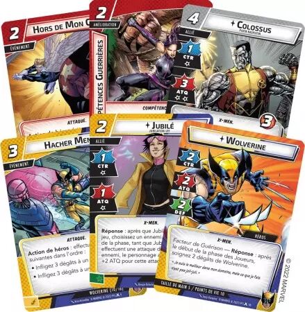 Wolverine commence la partie avec les Griffes de Wolverine en jeu. Utilisez-les pour jouer gratuitement un événement Attaque en subissant des dégâts au lieu de payer son coût en ressources. Si vous utilisez les Griffes de Wolverine pour jouer Attaque Plongeante, cette attaque gagnera Déferlement et Perçant. La capacité Facteur de Guérison de Wolverine vous permettra de le soigner de 2 dégâts au début de chaque phase des Joueurs.
